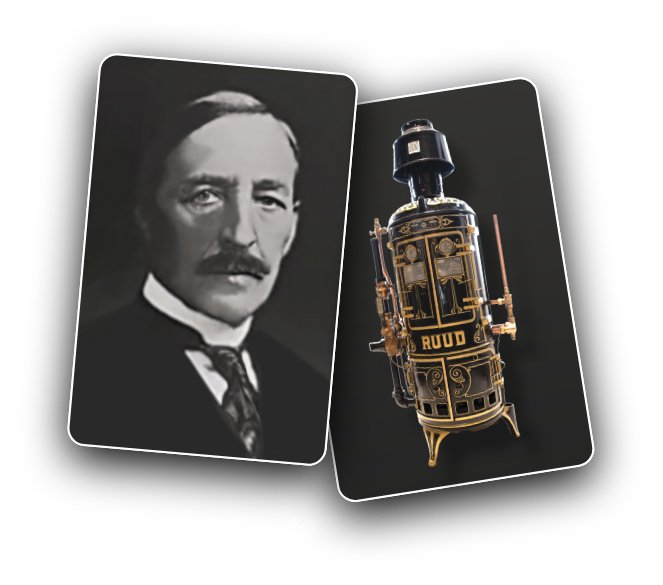 Viajaram para os EUA da Noruega no final do século XIX para trabalhar como engenheiro mecânico.Enquanto empregado, ele desenvolveu o primeiro aquecedor automático de água de armazenamento de gás, que lhe rendeu uma medalha de ouro na Feira Mundial de 1904 em St. Louis.Ele deixou o emprego, comprou os direitos de sua invenção e iniciou sua própria empresa.O Ruud pioneiro ganhou várias patentes em sua vida.A Ruud Manufacturing Company foi adquirida por Rheem em 1959, e Ruud se tornou uma marca principal da Rheem.